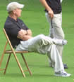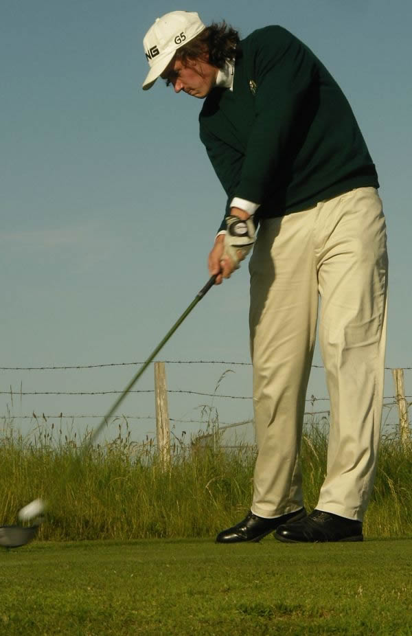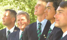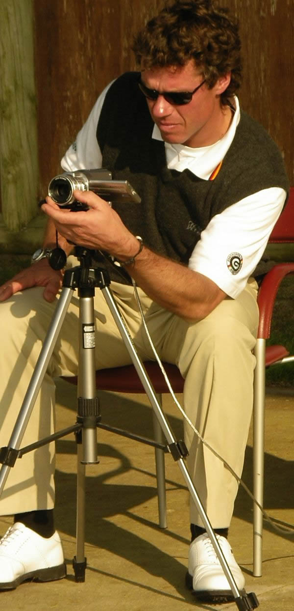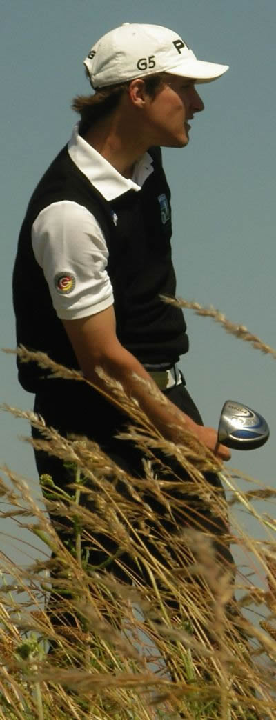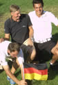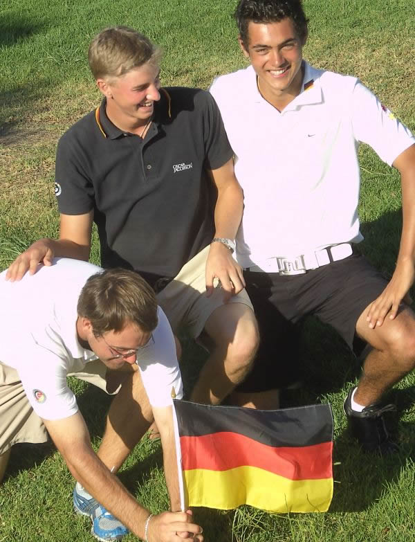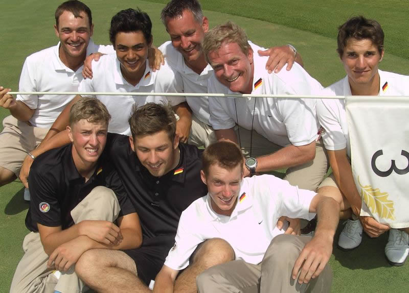 IAM Christian Schunck gewinnt die Internationalen Amateurmeisterschaften von Deutschland in Berlin - Seddin. Sein Vater (knieend) sah einen Sohn in Bestform und gegen die besten Engländer gewinnen. Damit qualifizierte er sich für die European Tour in Eichenried (BMW Open). Auf der DR gab es ein Wiedersehen mit US Tour Proette Miriam Nagl (1997 wurden wir gemeinsam mit dem Mädchen Team Vizeeuropameister), die sich mit Trainer Jochen Kupitz auf die US Open vorbereitete. Einzel EM in Biella, Italien Bei der Einzel EM ist Florian Fritsch am Ende unter den Top Ten. Ein Ausrufezeichen setzt Stefan Gross (von hinten), der prompt nach Ankunft von Trainer Ted Long (sitzend) den Platz mit -7 auseinandernimmt. Max Kramer biss auf die Zähne und spielte auf Top Niveau mit Bänderriss und dick angeschwollenem Fuss. |