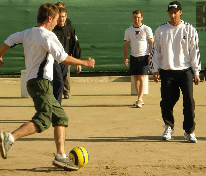 Intensiver Erfahrungsaustausch auf dem Golfplatz, dem Fussballplatz und am Abend von alten Teamkameraden (hier Kramer und Meitinger).